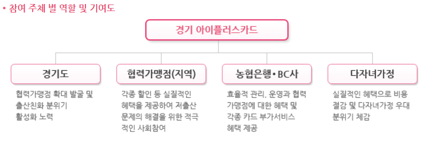 | 협력 가맹점 서비스 | 신용/체크 공통 | √ 분유제품 인터넷 쇼핑몰 이용 시 5 ~ 20% 할인 (남양유업, 일동후디스) √ 의료기관 할인 (산후조리원, 경기도의료원 등) √ 전시관 무료 입장 (경기도 박물관, 미술관, 백남준 아트센터, 어린이 박물관 등) √ 휴양시설 무료입장 및 숙박요금 성수기 및 주말요금의 10%, 비수기 요금의 30% 할인 (축령산, 상씨봉 자연휴양림) √ 공영 주차장 (주차료 할인) |