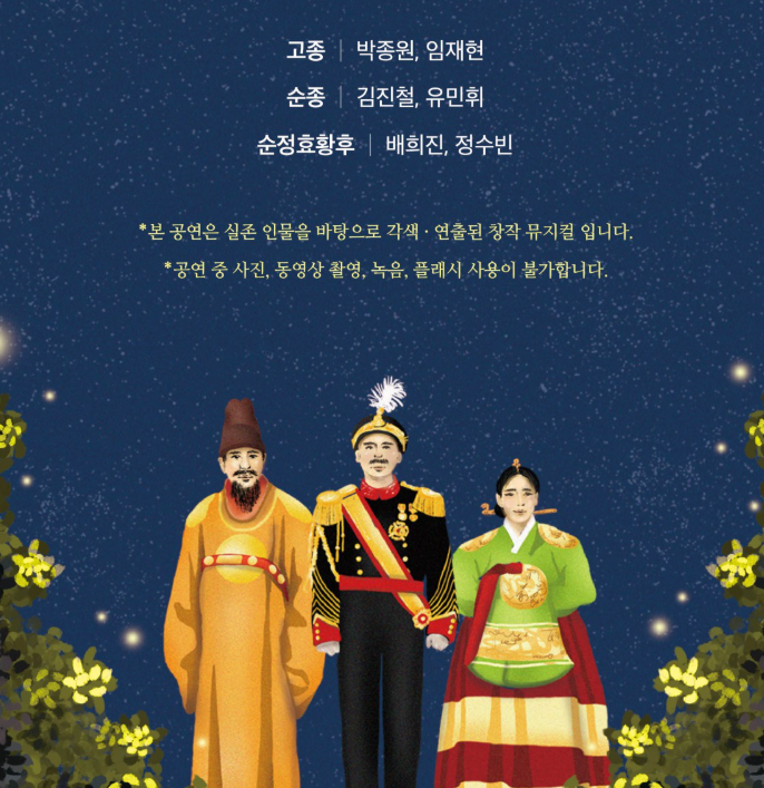 : 헤이그특사 파견 이후 강제로 퇴위한 고종과 황위를 물려받아 즉위하였지만 무력감에 빠진 순종, 그의 곁을 지키며 위로와 용기를 전하는 순정효황후. 대한제국의 꿈을 담아 완공된 석조전 안에서 대한의 이름을 되새기며 역사를 되짚어 볼 수 있는 뮤지컬 또한 덕수궁 밤의 석조전에서만 경험할 수 있는 뜻깊은 시간이 될 것입니다.