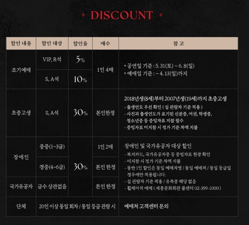 일반 예매의 경우 ~4/13 (일)까지 빠르게 예매하시는 분들에게는 좌석의 등급별로 VIP, R 석은 5% / S, A석은 10% 할인 혜택이 주어집니다.