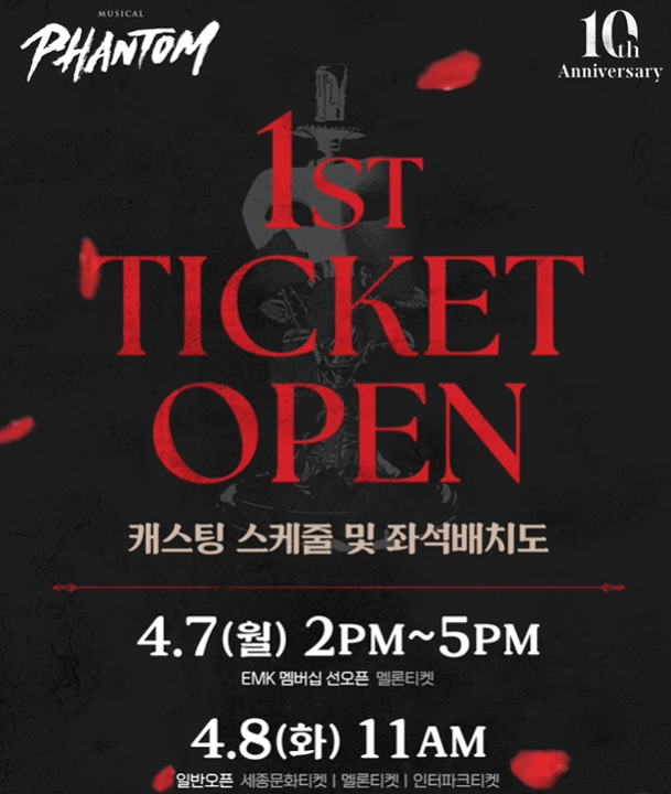 이후 일반 예매는 4/8 (화) 오전 11시부터 오픈되오니 꼭 티켓 오픈런 성공하셔서 환상적인 뮤지컬 '팬텀' 명당에서 관람하실 수 있기를 바라겠습니다.