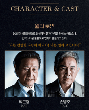 윌리 로먼 역에는 박근형과 손병호가 번갈아 무대에 오릅니다.