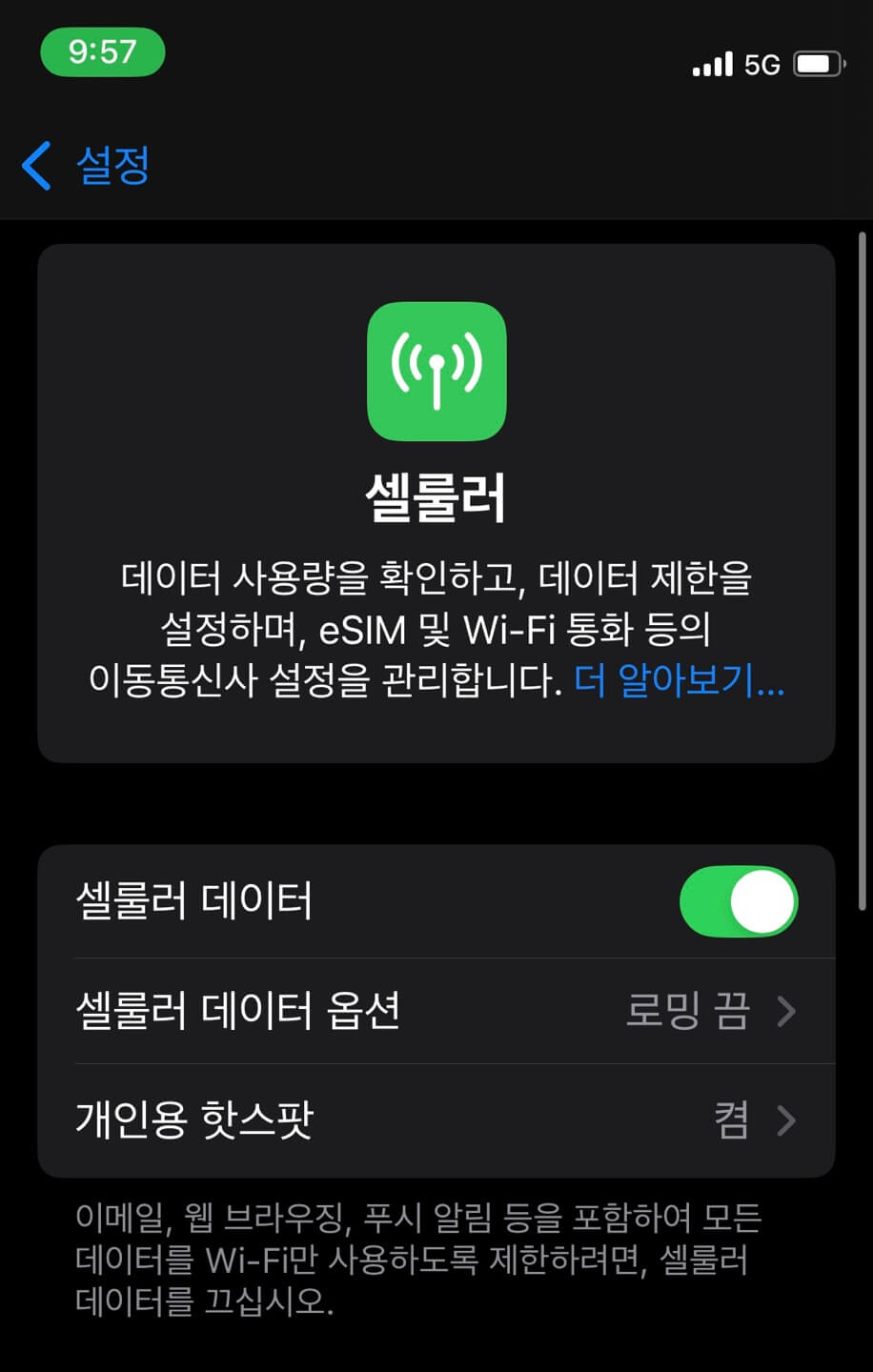 - 셀룰러 > 개인용 핫스팟 항목으로 들어갑니다.