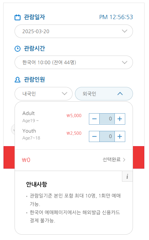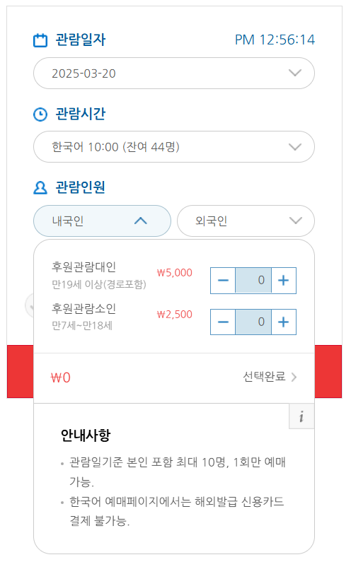 ① 간편 회원 등록 후, 이용을 원하는 날짜를 선택합니다. (관람일 제외 6일 전 오전 10시부터 선착순 예매 가능)