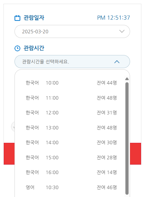 (한국어, 영어, 중국어 언어 별 설명에 대한 선택이 가능합니다. 단, 외국인 관람 시간에는 내국인은 예약이 불가하나 외국인 동반자가 있는 경우에 한하여 내국인 최대 2명까지 입장 가능합니다.)