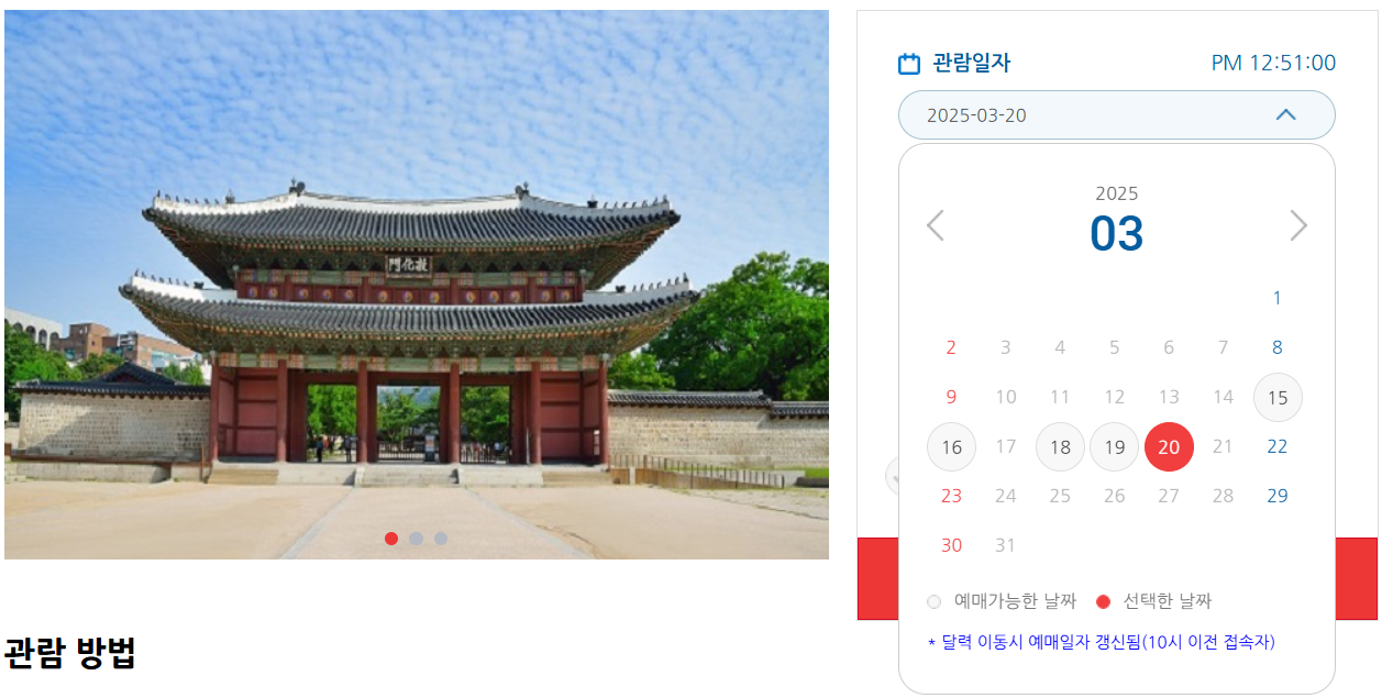 창덕궁 후원은 왕실 정원 특별 관람으로 관람 인원이 제한되어 있어서 특히 성수기에는 예약 가능한 날짜와 시간이 빠르게 마감됩니다. 벚꽃이 흩날리는 아름다운 계절, 특히 봄나들이객이 많은 4월에 고즈넉하고 멋스러운 궁궐 체험을 기대하시는 분들은 빠르게 신청하셔서 사랑하는 사람과 멋진 추억 만드시기 바랍니다. 당일 현장 구매 (한정 50인)도 가능하기는 하지만 현장 구매의 불확실성으로 인해 낭패를 볼 수 있으니 지금 바로 창덕궁 후원 예약하기 접속하셔서 원하시는 날과 시간을 선점하시기 바랍니다!
