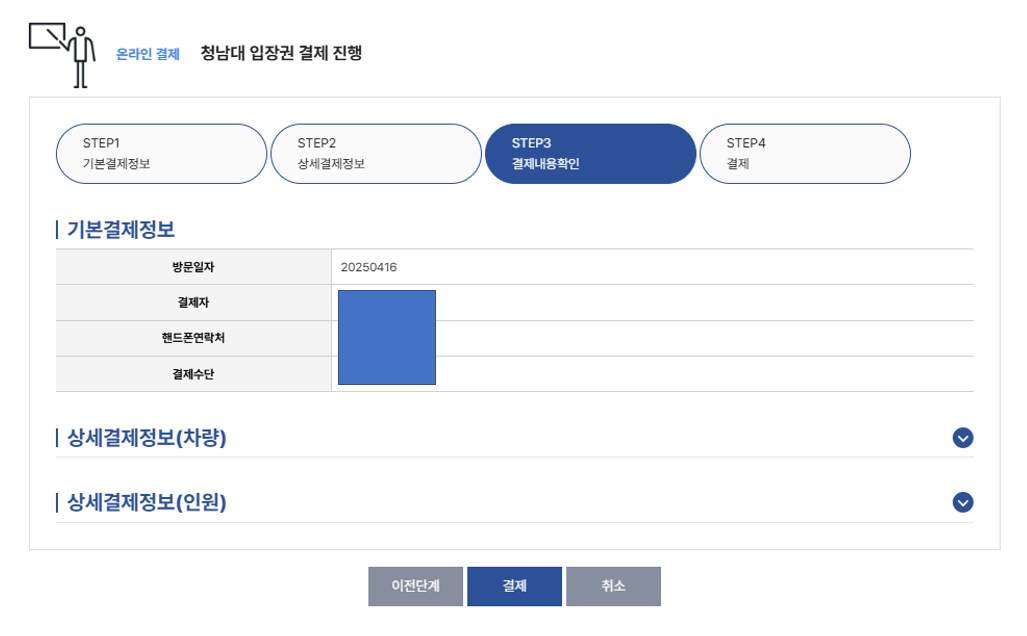방문 일자, 결제자, 핸드폰 연락처, 결제 수단 등 모든 정보를 확인하고 최종 [결제]를 완료합니다.
