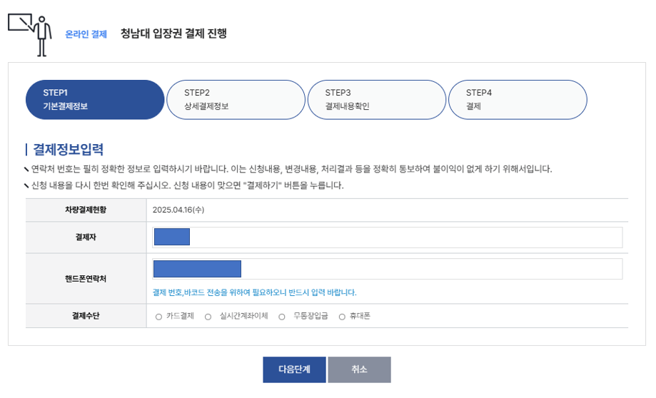 - 휴대폰 결제의 경우 본인 휴대폰의 소액결제 차단 해지를 하신 후 결제를 진행하시기 바랍니다.