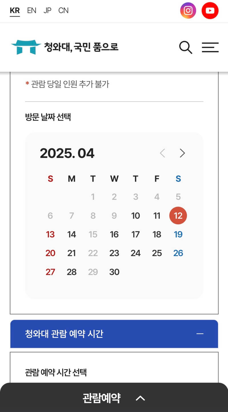 모바일로도 예약할 수 있습니다. 다음과 같이 네이버에서 청와대 홈페이지를 검색하여 온라인 예약 하는 방법 참고하여 주시기 바랍니다.