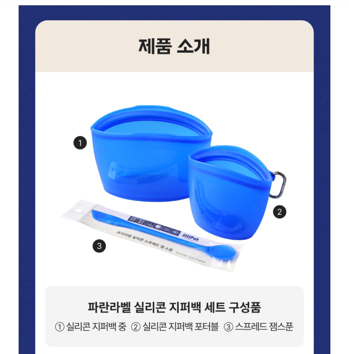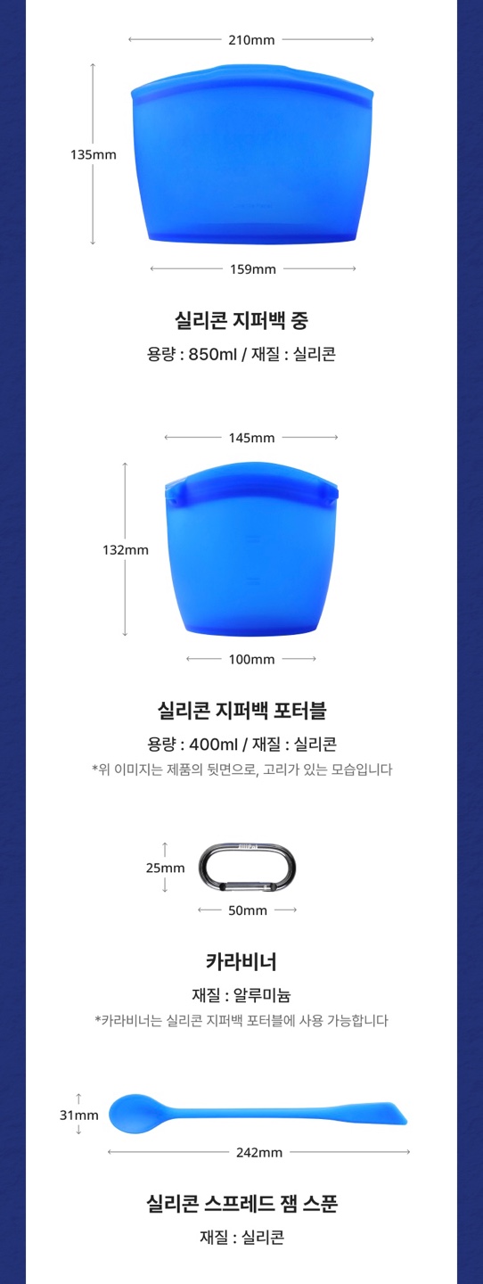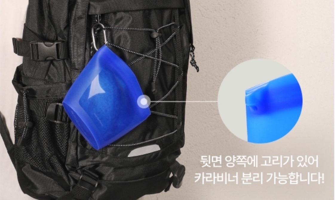 | 2 | 실리콘 포터블 지퍼백 | 400ml 용량, 간단한 식재료 보관 가능 (채소 스틱 추천) / 카라비너가 함께 제공되어 가방에 걸어 야외용 푸드백으로 활용 추천 |