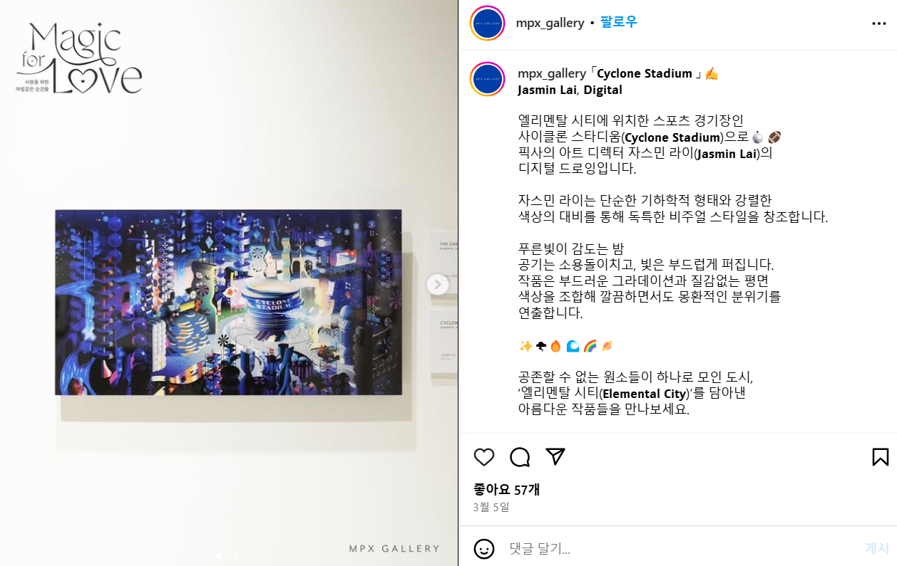 전시가 열리고 있는 MPX Gallery인스타그램에서도 PIXAR ART COLLECTION : Magic for Love (픽사 아트 컬렉션: 매직 포 러브)에 대한 이벤트가 진행되고 있습니다. 전시 관람하시기 전에 이 부분도 확인하셔서 아이들과 좋은 추억 만드시기 바랍니다.