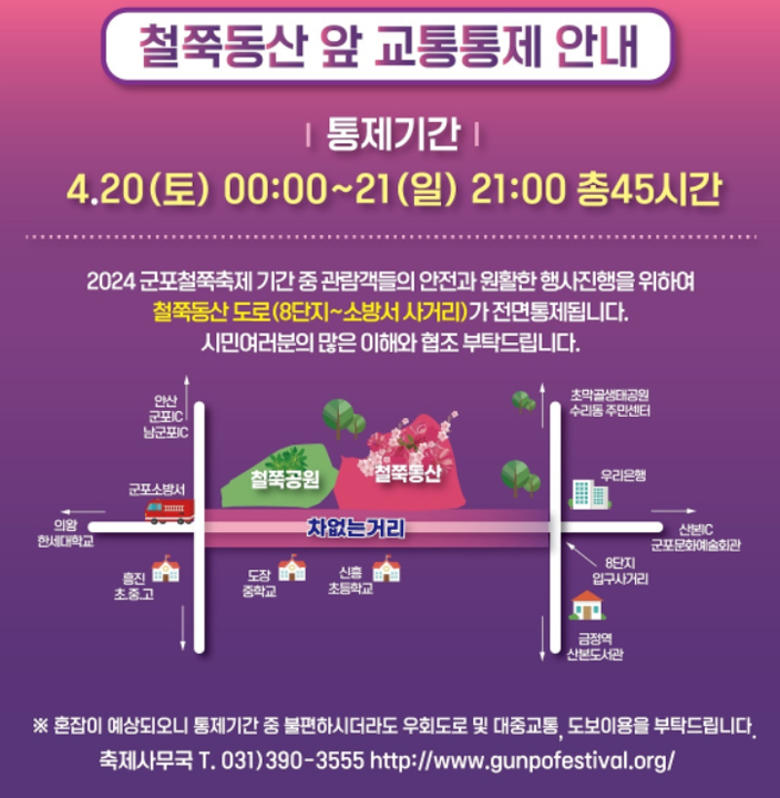 군포철쭉축제는 차 없는 거리를 조성하여 차량 통제가 이루어지기 때문에 대중교통 이용을 적극 추천 드립니다.