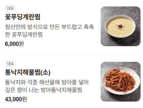 - 통낙지해물찜 (소): 43,000 원 / (중) 56,000 원 / (대) 68,000 원