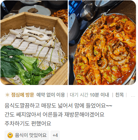 낙지볶음과 편백 보쌈이라는 독특한 메뉴 구성으로 현지 주민뿐만 아니라 관광객에게도 인기가 높습니다.